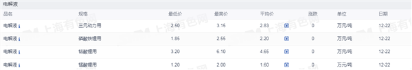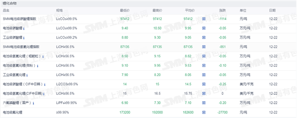 证券之星新能源车行业周报:据上海有色网,截止12月22日,电池级碳酸锂9.4-10.5万元/吨,均价9.95万元/吨,环比上一工作日下滑0.05万元/吨;工业级碳酸锂8.8-9.3万元/吨,均价9.05万元/吨,环比上一工作日下滑0.05万元/吨。近期下游正极材料企业对碳酸锂的采购需求依然疲软,而市场中个别锂盐企业依然存出货意愿,供需博弈下市场碳酸锂现货价格仍弱势运行。另外,近期贸易企业出货情况同样不容乐观,部分贸易企业后续有交仓想法。