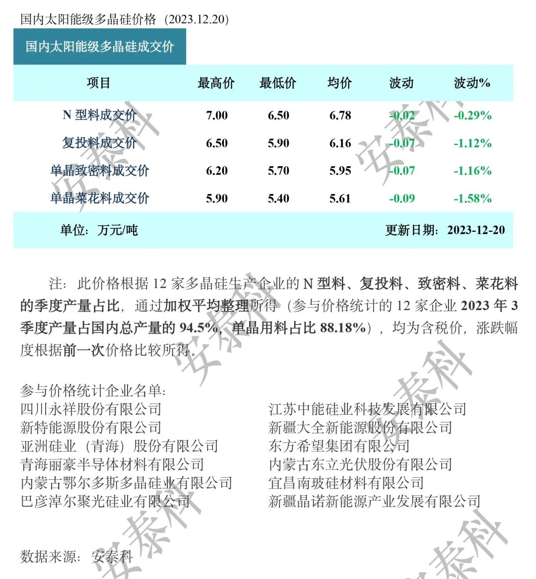 当前整体价格走势维持悲观,同时,电池厂家持续承受着低档的电池价格,当前在采购硅片上面临压力,本周观察电池环节减产幅度也持续提升,在年末拉货需求缓慢收缩的同时,硅片价格仍将视自身排产调整与否对应变化。