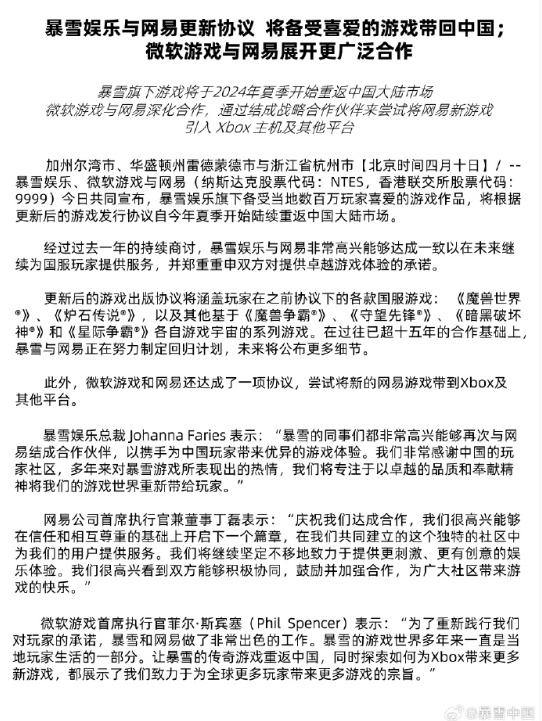 新东家微软做媒 暴雪官宣携手网易回归