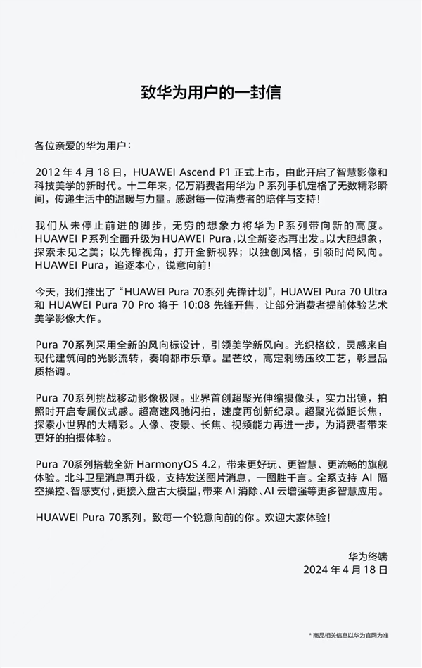 4月18日,华为发布《致华为用户的一封信》,官宣华为Pura 70正式开售。