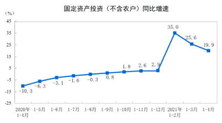 国家统计局今日发布的数据显示,1-4月份,全国固定资产投资(不含农户)143804亿元,同比增长19.9%;比2019年1-4月份增长8.0%,两年平均增长3.9%。其中,民间固定资产投资82519亿元,同比增长21.0%。从环比看,4月份固定资产投资(不含农户)增长1.49%。